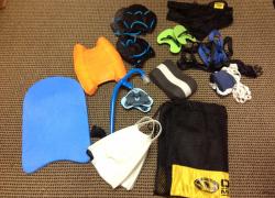 Kickboard, ankle strap, fins, snorkel, kick/pull (the orange thing), pull buoy, pocket suit, parachute, rope, and 4 different types of paddles from SwimOutlet.com